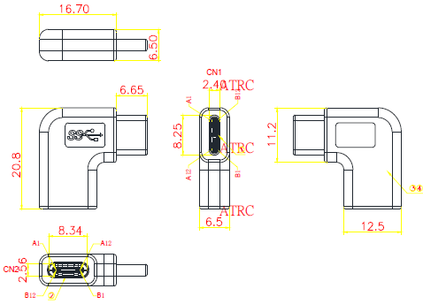 360083 ADAPTOR, USB 3.1C MALE TO FEMALE 90° SIDE